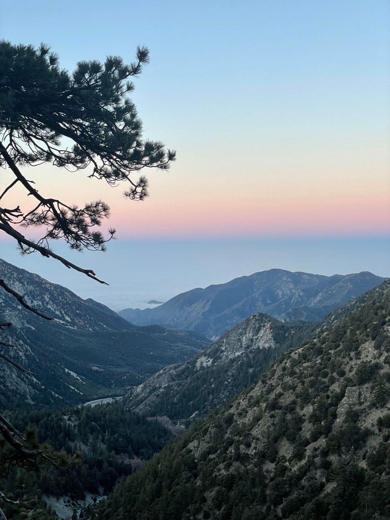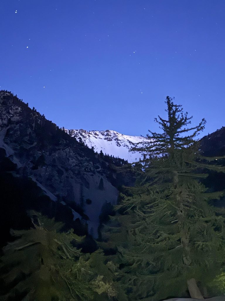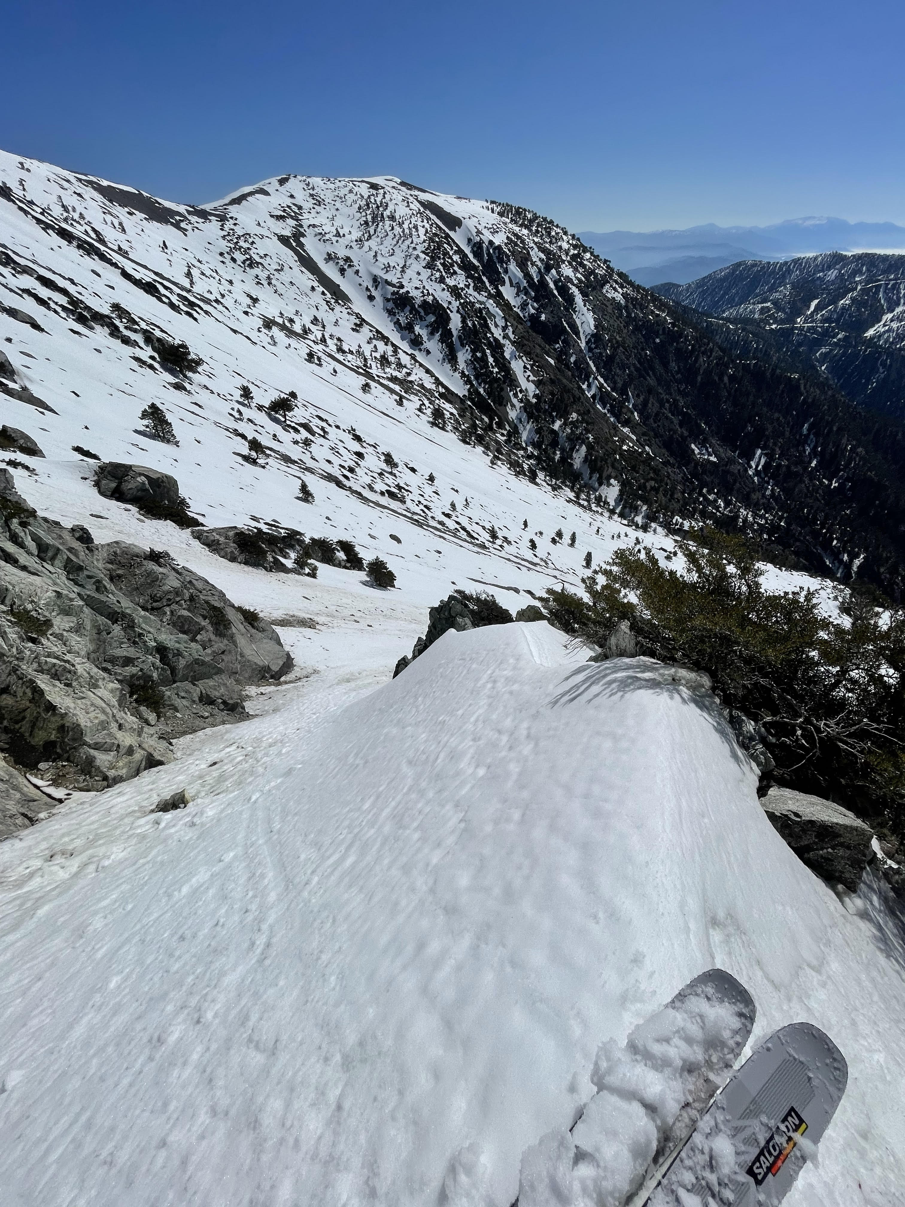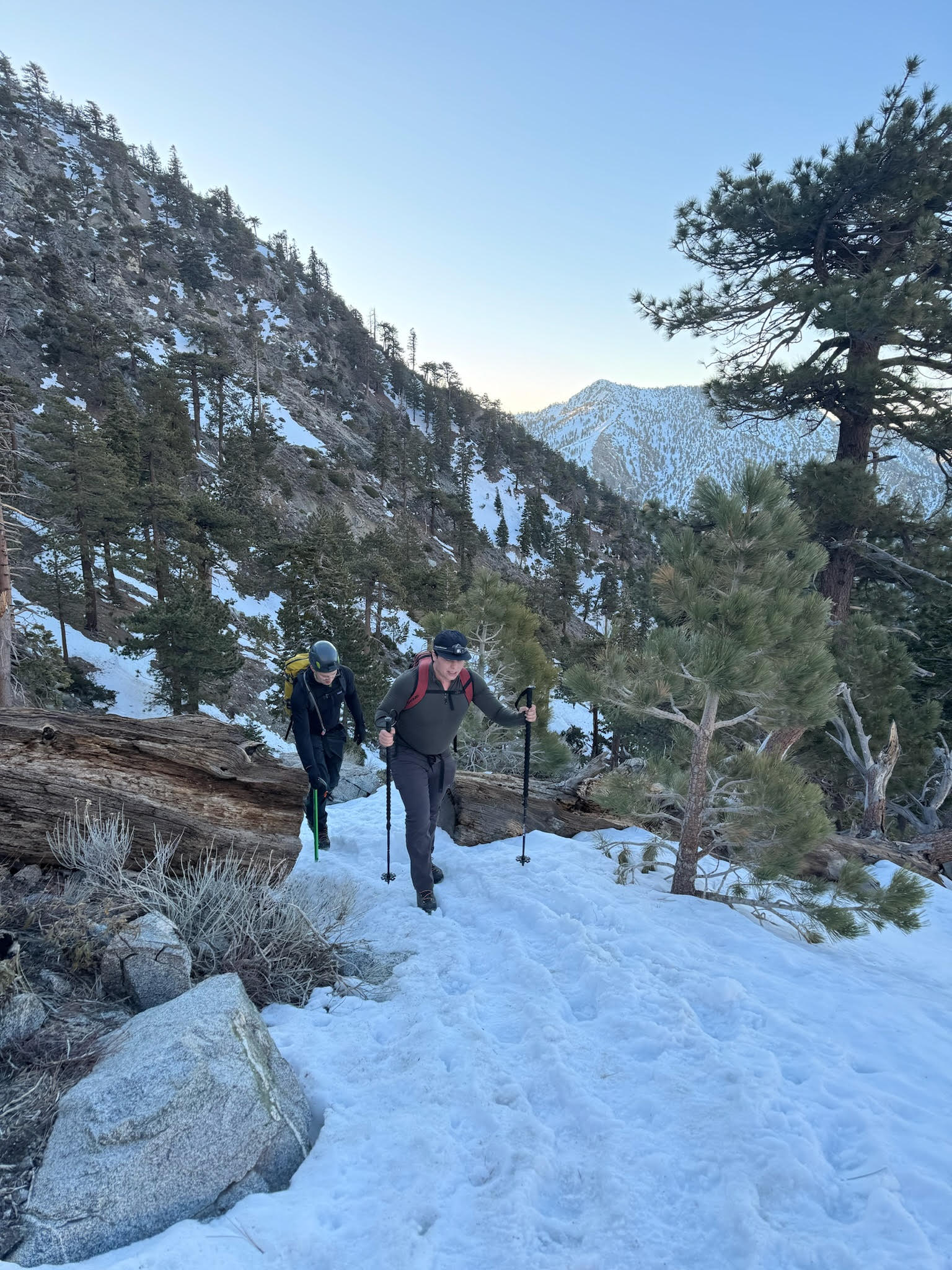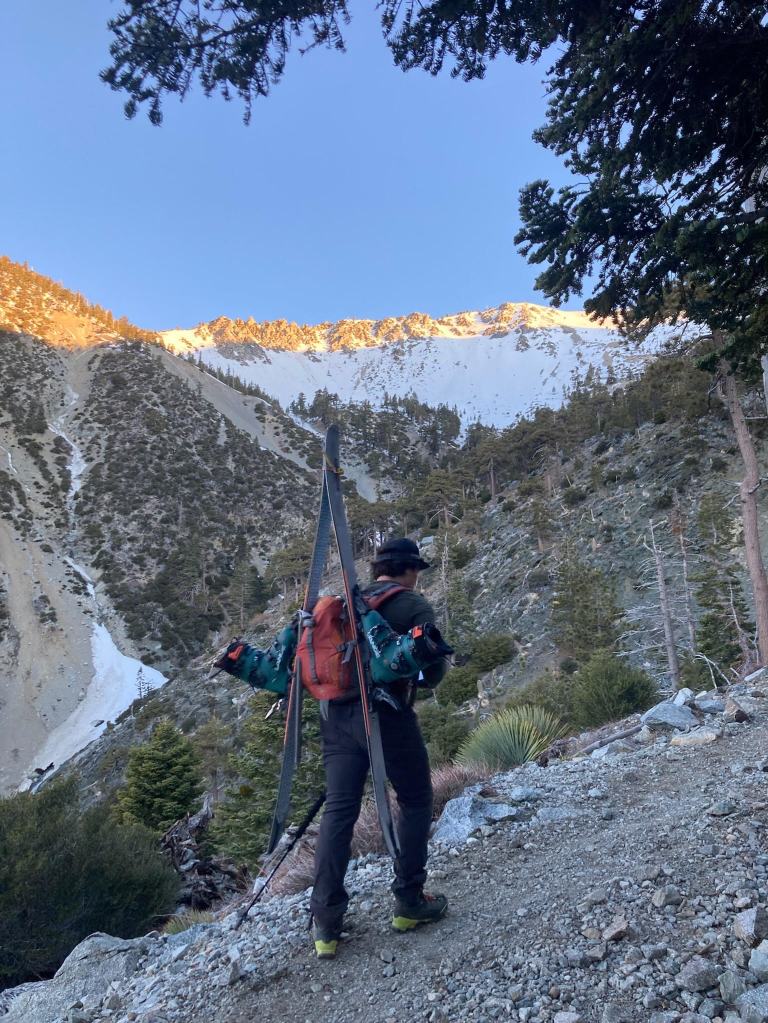 This past spring was the start of my journey into the winter backcountry. I took an AIARE Level 1 course and toured a few times into simple terrain in the Wasatch range of Utah. However the first real trial run begun with Mt. San Antonio (aka. Mt. Baldy) in the Angeles National Forest of Southern California, a lot closer to my LA homebase. It’s a fairly straightforward hike, starting with a ~3 mile trail of switchbacks from Mt. Blady village to a small ski hut at the base of a headwall 800 vertical feet from the summit. On April 13th, 2024, my roommates and I set out on a ‘scouting mission’ to first summit the peak and then learn more about the potential to ski some of the fantastic couloirs within Baldy’s headwall. Slight wind & rain was predicted on that Saturday morning as we left the Redondo Beach house at 4 o’clock in the morning. The alpine start kept us crossing fingers for a better outlook and as the morning’s first light appeared on the slopes above it was clear that we’d lucked out with pristine clear conditions.
