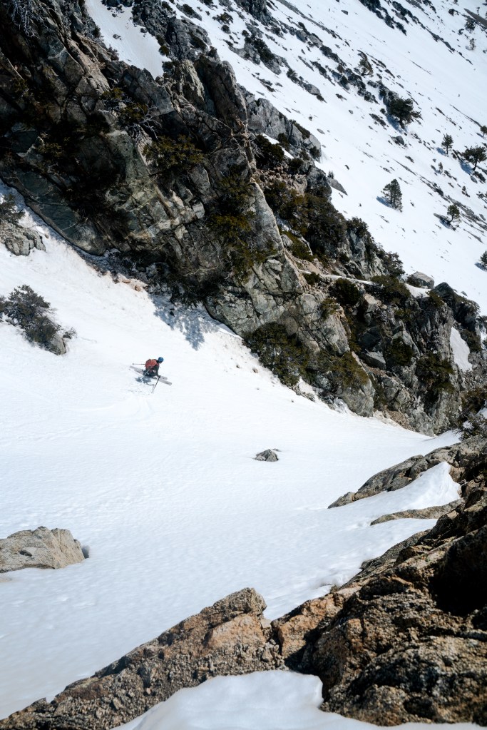 Following some hydration and calories, we were ready to make our ski descent and I was particularly stoked for it. The chosen line was called the Hourglass Chute (also called the Shit Chute) and was one over from the Girly Man ascended by Matt and Trevor. Ironically, Matt did not pack his snowboard and Trevor was an intermediate skier. While Trevor opted for the more mellow bowl I had partially skinned, I was going solo down the chute. Upon inspection, the upper snowfield was near perfect: prime corn snow, untouched, and a 40 ish degree slope. The first 10 turns were awesome and it was clear this chute was the perfect selection for the day. I was pumped with adrenaline as I approached the crux at the bottom of the snowfield and the center of the hourglass. At this point, the lactic acid in my legs from the vertical experienced throughout the day had fully caught up to me. Not wanting to risk any falls, I made a few careful hop turns and side steps through the narrow and steep choke. Soon after I was nested on a safe perch immediately after and decided to take a brief break. After that point was a short runout and right turn into the longer bowl apron. Linking a few turns at a time, I made it down the slope feeling sore but full of excitement. The only hiccup was some rockfall behind me that motivated my quick descent to a break point in the rocks below. While I waited for Matt and Trevor, I realized that I skipped my meeting spot (a small bush at the chute exit) and caused them a brief panic before we finally met up at the ski hut. Trevor had his own descent adventure while navigating his first backcountry ski down the Baldy bowl. He took a single tumble, but otherwise made some good turns visible from Matt & I at the exit. Matt on the other hand repeated our glissading adventure from the week prior.