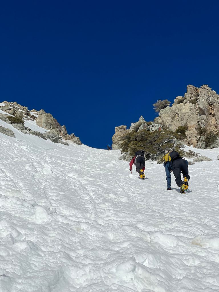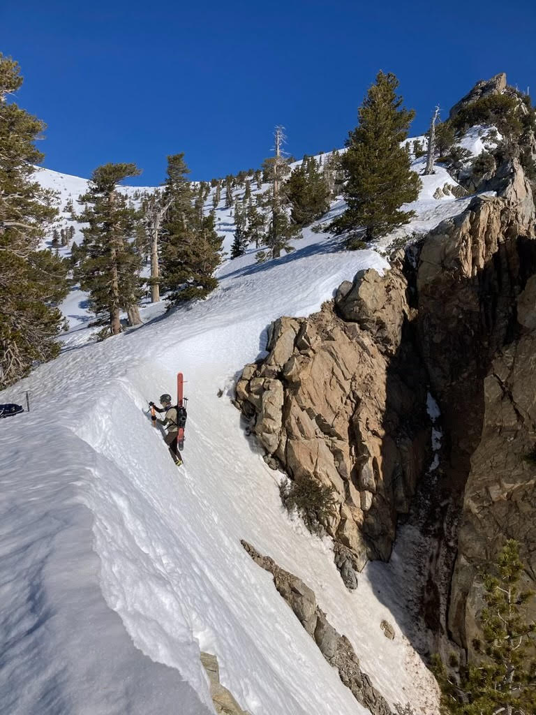 Matt and Trevor aimed to climb the Girly Man couloir, a narrow and steep classic of the headwall that made the most direct passage to the ridgeline marking our summit for the day. I was the only one in the group to have alpine touring bindings, so I took a stab at skinning up the larger open bowl to the left of the rocky headwall. While making some switchbacks up the slope, I was accompanied by a group of three slowly hiking with crampons and axes. While otherwise unnoteworthy, this was probably a signal I should have been booting along with them. Following some more sketchy kick turns and a near fall, I made my way over to a tree and transitioned into crampons. After another 30 mins and many groups passed, I made my way up to a larger triangular rock on the ridgeline where my group was waiting. Trevor and Matt had successfully climbed the couloir and seemed to have a blast doing so. Looking down the slope was quite intimidating, but it was also not on the table for a ski descent given its rock filled crux.