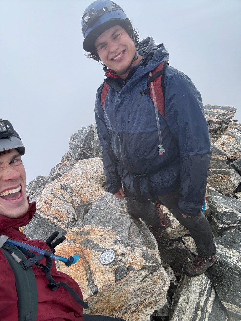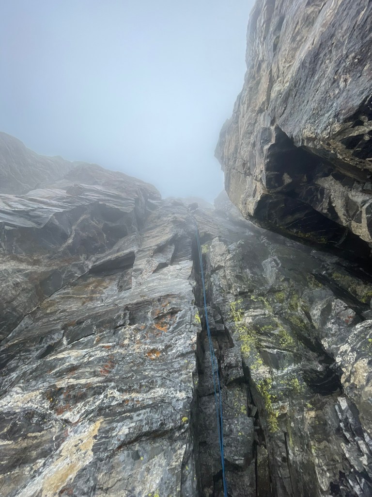 At this point the weather was slowly starting to get worse and Trevor was making his way through the first pitch. Our lack of radios made communication hilariously difficult for a traverse pitch, but luckily he understood my plethora of rope tugs as a sign that he was on belay. Next a free solo-ist passed us and tugged on our rope during the sketchy off width section. Then Trevor arrived and I started up the next pitch. At this point I was having a blast and was completely in the flow state. Climbing was not very difficult and the worst of the exposure was passed us. Pitch two had another natural tunnel and I was able to run out the majority of the climbing. Soon enough we reached the Owen chimney to mark the start of the third pitch. I continued to lead to help speed up the day and was feeling great. The weather on the other hand only got worse: there was a lot of wind, the start of rain, and a cloud came in to limit visibility quite a bit. Despite this climbing was still easy and pitch three only had one move that was a bit insecure. Otherwise we made it to the top, traversed over a relatively flat section to Sargent’s chimney, and into the last pitch. This chimney was the easiest so far and I was having a blast. Our timing was still pretty good but I knew we were still chasing the clock to avoid being stuck in worse weather still.