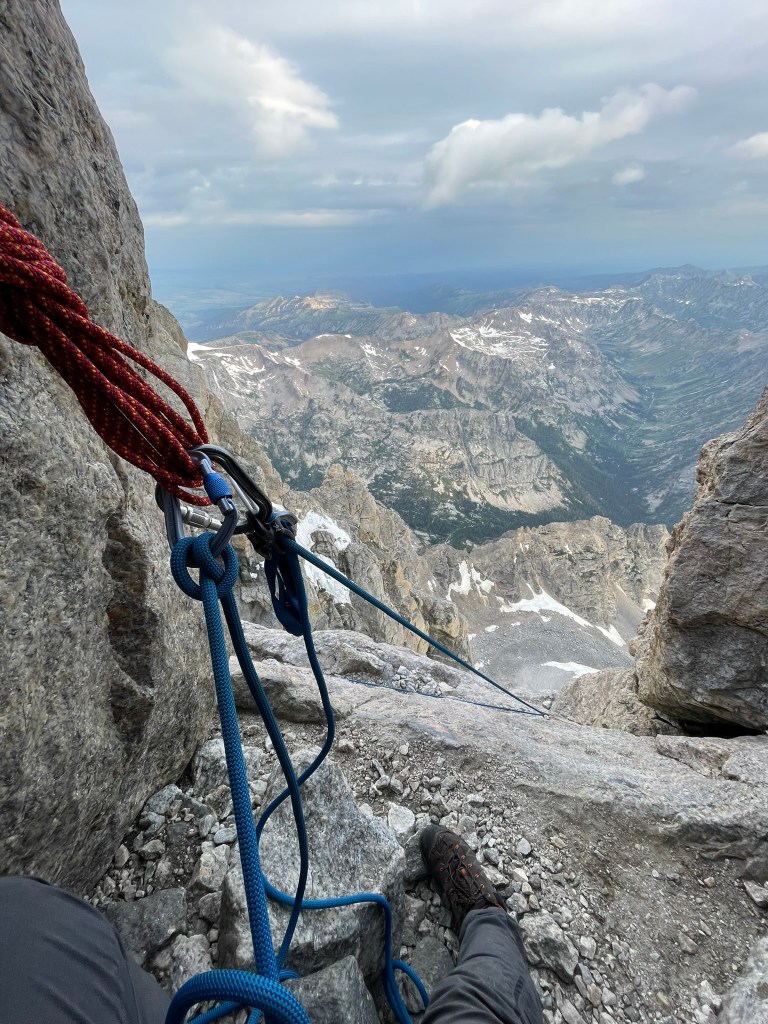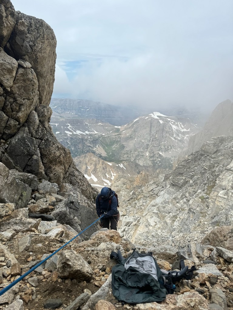 After finishing Sargent’s, we unroped and checked our maps one last time before making our summit push up the last few hundred feet of scrambling. With the clouds fully soaked in we had trouble finding any of the features described in Wyoming Whiskey’s page, so I took the lead and started up what looked like the best path to me. Soon we collided with the top of the Exum Ridge and could see the true summit lingering in the distance. On our right was the imposing east face snowfield, a crazy 50 deg slope where most of the ski descents for the mountain began. Traversing the ridge was a crazy experience, we straddled some sections of knife edge terrain & felt like we were on some crazy remote wasteland while covered in dense fog. Then we finally arrived on the last boulder patch and found the summit marker. At last we had finished the route and achieved this Grand milestone. Both of us were soaked to the bone and still feeling the rush of adrenaline from the climb. We looked around, took some photos of the blank white landscape, and then quickly made our way back to the top of Sargent’s chimney. There was a somewhat maintained anchor here and we made it down without any issue towards the main rappel below. Navigating this ledge section was fairly straightforward and we found a massive and well maintained anchor perched above the large cliff below. We had a 60 meter rope, which required us to stick as far as we could to the looker’s right of the cliff in order to make it to the ledges on the Upper Saddle. I tossed out the rope and heard it whip through the gusts of wind in front of us. On the way down I unsnagged the rope several times and successfully made it to the ledges without much issue.