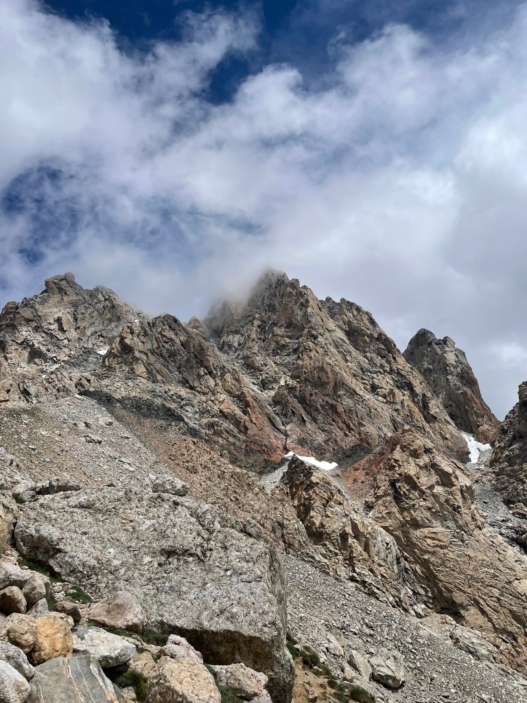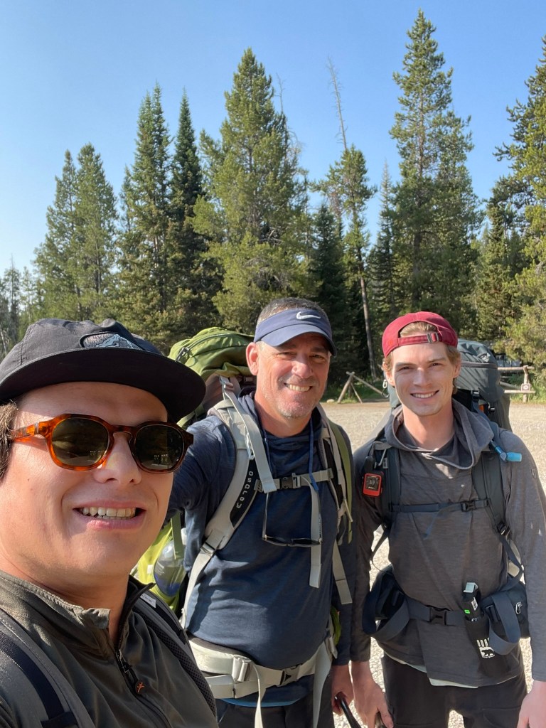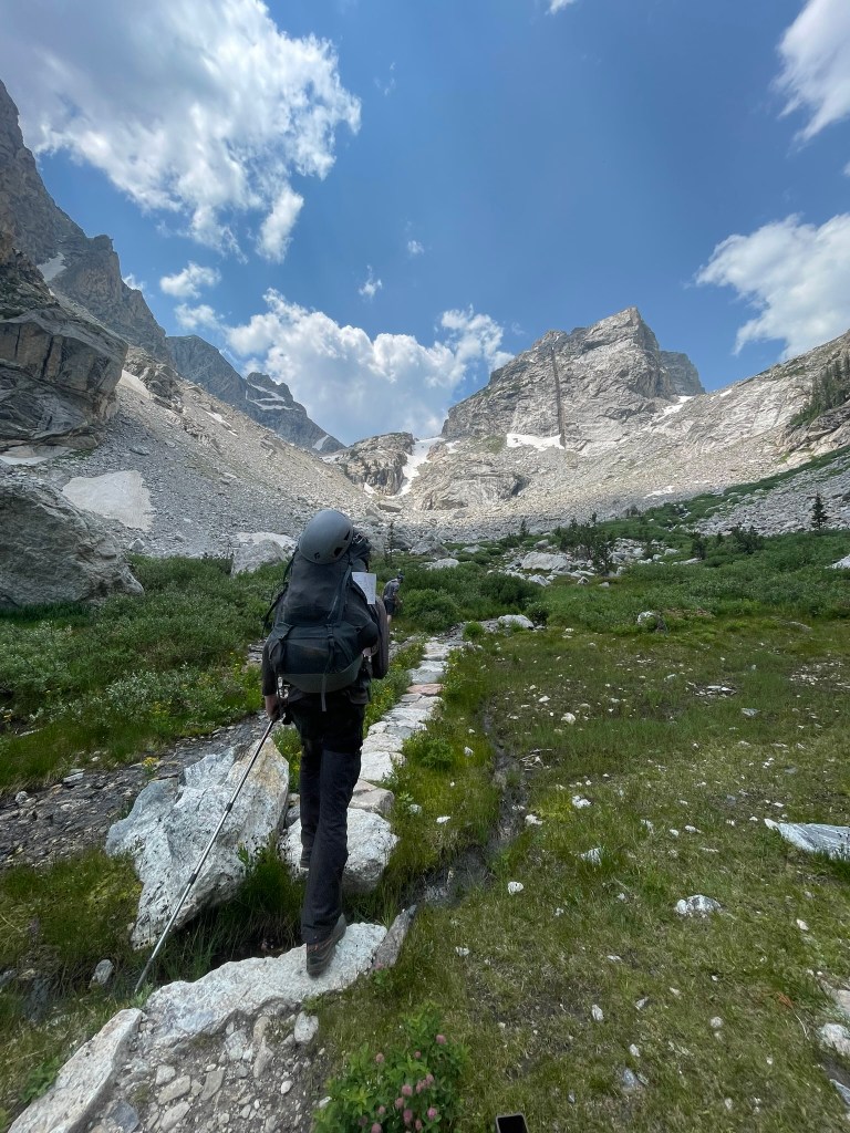When we first committed to climbing the Grand in the early spring of 2024, July seemed plenty far away to avoid thinking about it in earnest. But before I knew it, I was on a flight to Jackson and glancing at its striking summit within the broader Cathedral group. There is something special about the surrounding area – the mountains rise dramatically from its peaceful valley and the alpine environment is defined by massive and sharp granite peaks. People come from all across the continent to climb and ski in the Grand Teton National Park, where its namesake peak stands as a right of passage in many ways for the local community. While descending the Ford-Stettner couloir or completing the ‘picnic’ is probably out of my league for the next couple years, these traditions are part of the inspiration for making the journey out to climb this mountain and acquiring the skills necessary for an attempt in good style. After landing mid-week, I met Trevor and his dad after they had made it back from hiking in Death Canyon. We would stay in the Jackson Hole resort hostel for the next couple days, giving us a ~2 day window to camp at the Grand Teton’s lower saddle and make some summit attempts. For now we ate in town, visited the local mountaineering shop for last minute gear, and meticulously researched beta on the route (mostly through https://wyomingwhiskey.blogspot.com/). The next morning we would wake up and drive to the trailhead, starting our journey towards our basecamp.