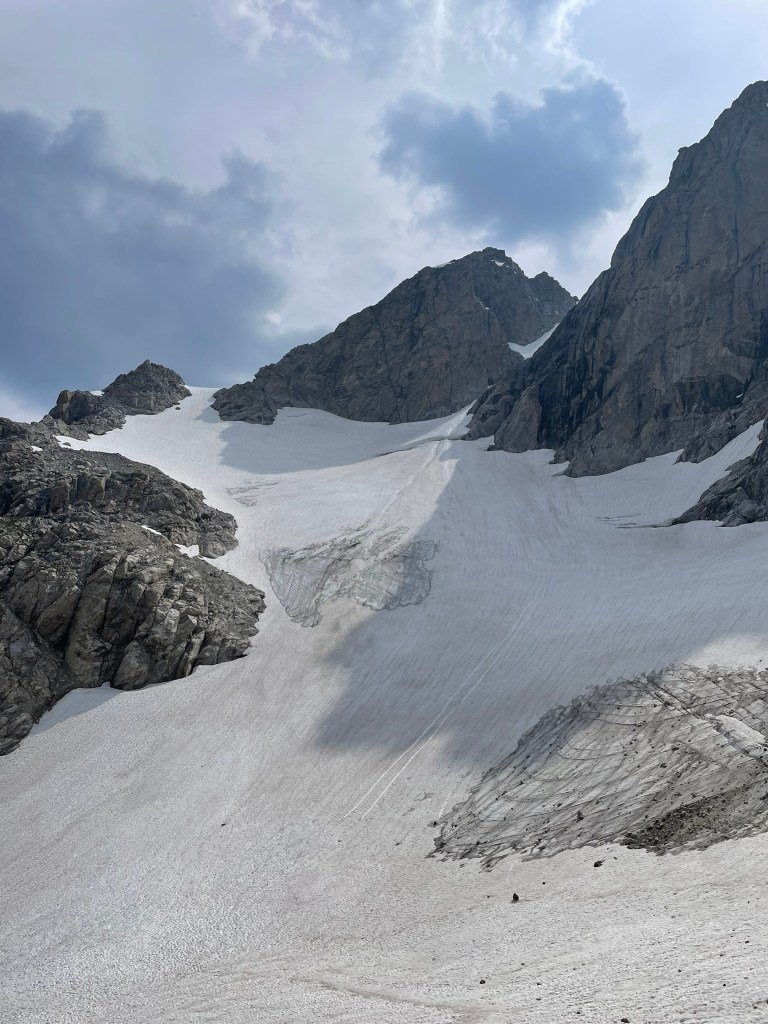 Trevor, his dad, and myself arrived at the Lupine Meadows Trailhead around 9am and were gifted with some beautiful weather. Our packs were heavy and filled with overnight gear, a rack & a half of gear, and a 60 m rope. The first ~2.5 miles of the trail felt smooth as we navigated a well maintained path and several switchbacks into Garnett Canyon. As soon as we rounded the corner into the canyon we got our first few of the huge granite walls cut by glaciers which loomed below the Grand’s north valley. Below us were a handful of lakes that accompanied the larger Jackson valley and made for a fantastic viewpoint. Not long after we made it to the first milestone of the hike: the platforms campsite. Here was the start of the alpine meadows of Garnett canyon and where Trevor’s dad would stay the night. We took a quick lunch and took in the views before our journey continued up the bolder fields ahead. We also were able to fill up completely on water from the river splitting through the canyon, a huge perk of the trip that would continue until our camp at the lower saddle. Trevor’s dad stayed back at this campsite where he would wait for us to get back from the summit and give us some peace of mind that help was close if we needed it. Ahead of us was still about 2500 ft of elevation gain across two rock bands before our campsite. We started off again and were immediately met with a beautiful alpine meadow perched right below the middle teton’s imposing east face. In all directions were huge granite walls carved by extinct glaciers that once inhabited this canyon. Soon we found ourselves on a slog of steep switchbacks which lined these walls ahead of us. The trail quickly became less and less friendly as we started to hop over large moraine fields and up looser talus slopes between sections of trail. Once we made it over the first rock band, the landscape changed dramatically into a seemly barron wasteland of rock and ice. It was incredible to witness and soon enough we could just make out the Grand Teton’s massive exum ridge as we passed to the north fork of Garnett Canyon proper.