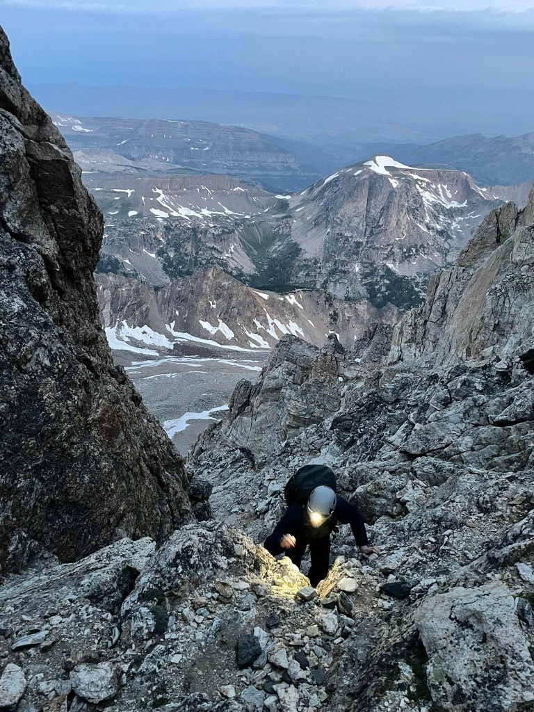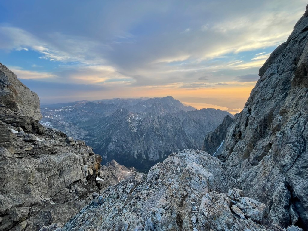Sleeping was difficult, I got brief moments of true rest interspersed with many more moments of uncomfortable churning. Getting out of the tent at 4 in the morning was rough, but both Trevor and I got to work with final packing and making breakfast. We shared a bowl of oatmeal and then made our way towards the gradually steepening trail headed to the Upper Saddle. The route ahead was about 500 ft of talus and 1000 ft of ~4th class scrambling before the roped climbing even started. Route finding was the crux here and we both put in a ton of time researching our way. First up was the chockstone chimney, a ~50 ft section of exposed scrambling with pretty loose rock. This went by quickly and we found ourselves making it through the next couple of obstacles without much trouble. Climbing through the ‘eye of the needle’ was a highlight as we navigated our way through a natural cave / tunnel feature in order to avoid the more precarious ‘Briggs Slabs’ on our left. We also met some climbers on their way to the Upper Exum route and point them towards ‘Wall Street’ – a crazy exposed ramp that connects the scramble to the prominent Exum ridge. After this point the sun started to rise and we were gifted with a glorious orange glow to light up the range behind us. The Upper Saddle was in sight, but we took a moment to bask in the view behind us as it was the highlight of the trip so far in my eyes.