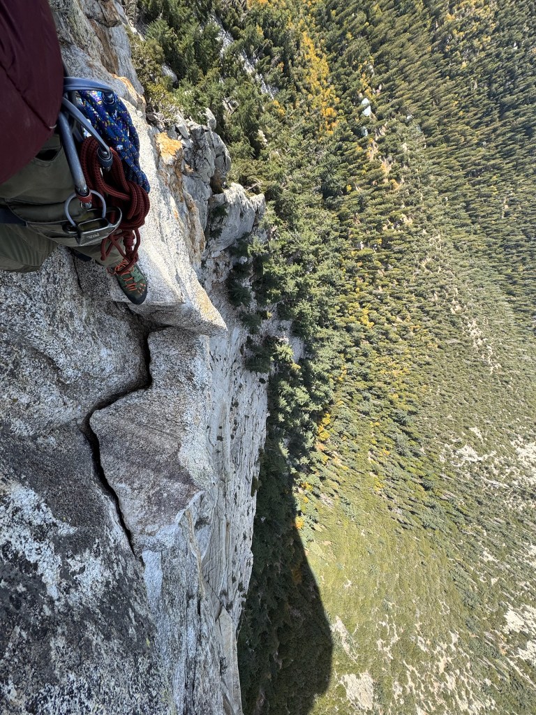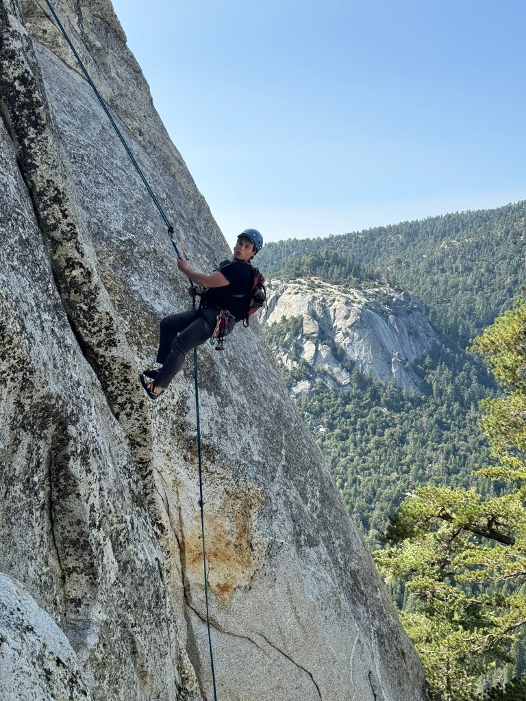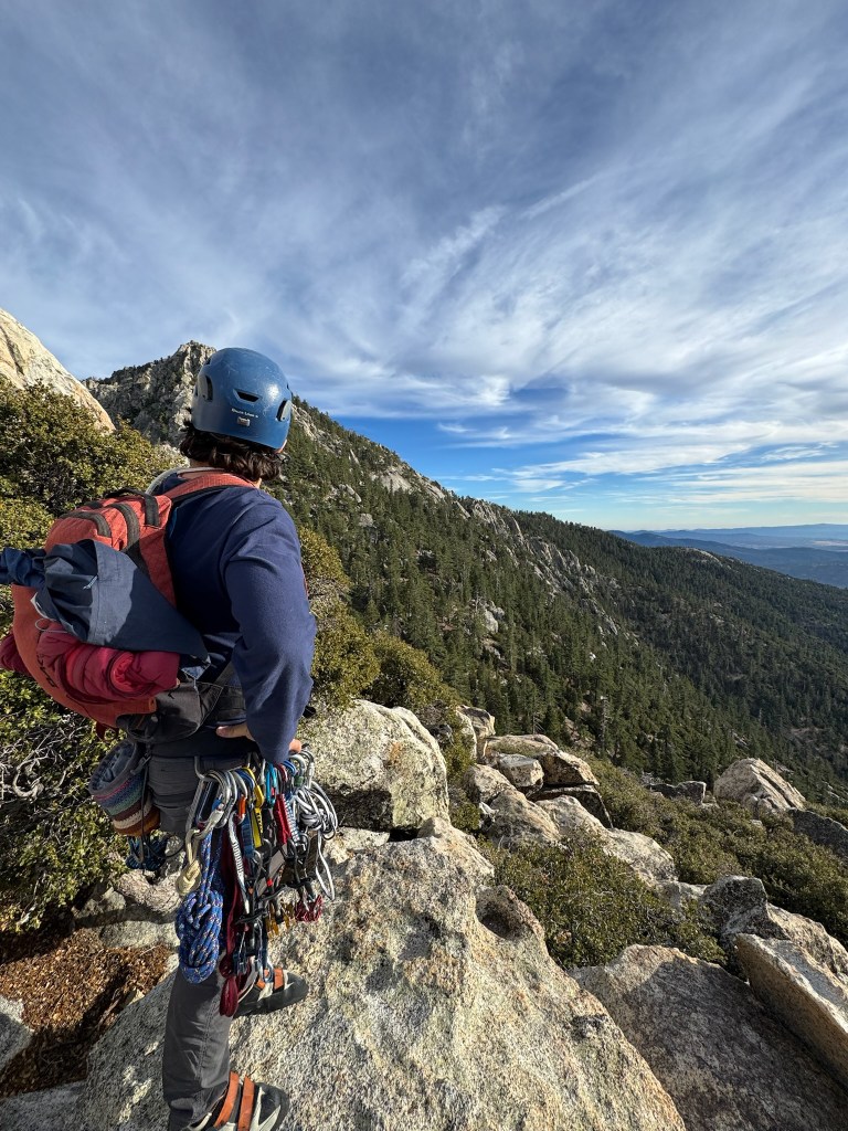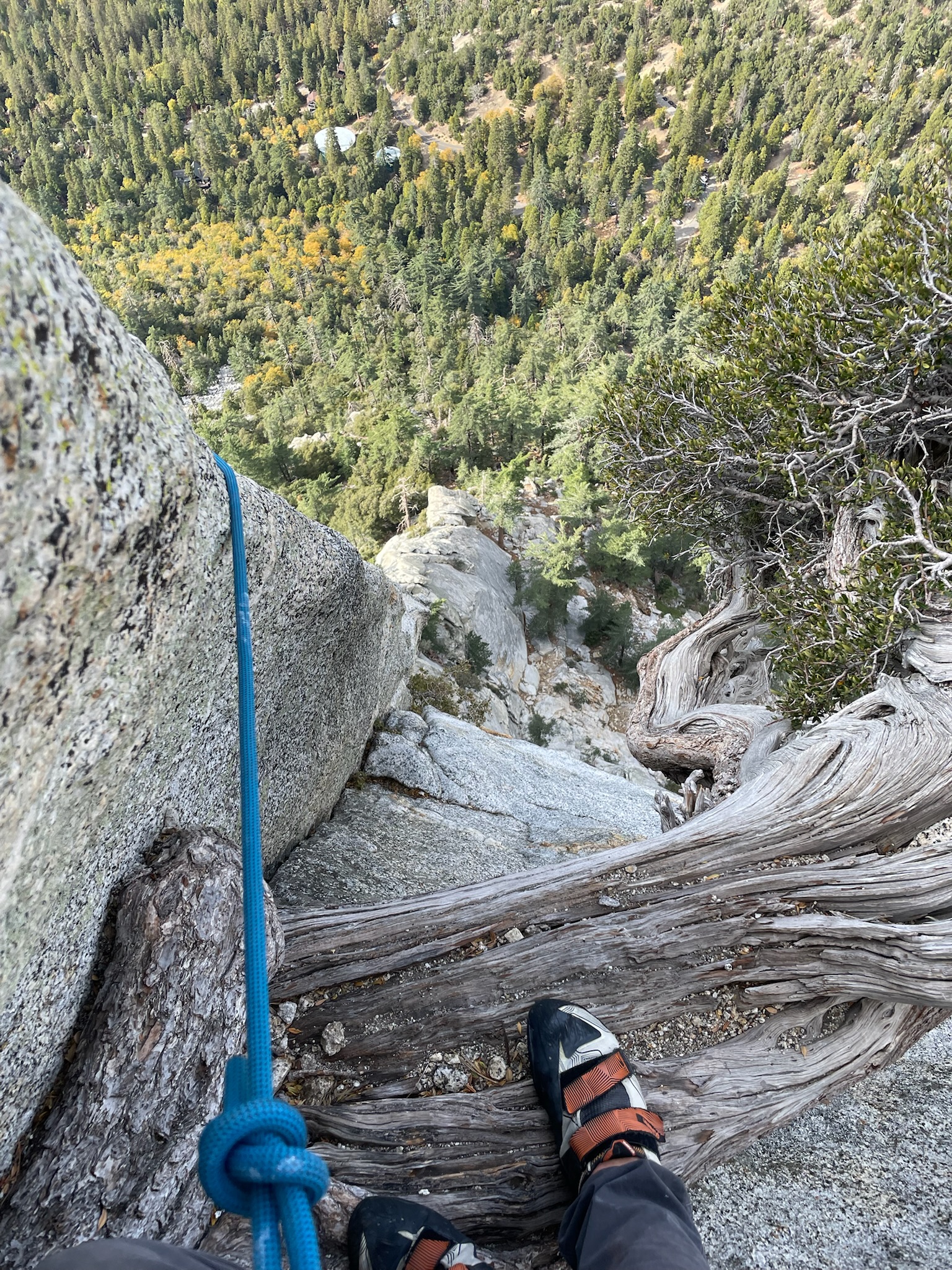 Turns out I had nothing to worry about, pitch 3 was spectacular. There were great placements for gear and good handholds despite a relatively steep slope and way more exposure than before. Near the end there was a mini exposed corner with a hidden glory jug that made for a great finish. The belay at the top was bushy and crowded with the next group, but I was glad to get a breather before the doubtful corner looming on pitch 4. Trevor sped up and after a few minutes of waiting we were ready to rip again. The pitch started off with a protected chimney that progressively became narrower until it ended at a tiny ledge. After this point, there was a single crack for a blue C4 cam and no more hand holds. Instead the ledge rounded a corner and required an exposed step over to another large ledge incut about 2 feet into the slope. The step over itself looms over the base of the route about 300 feet below. I stood over the edge patentiently and calmed myself down. Next I carefully placed my right foot at the left most point of the ledge, allowing my left foot to slowly round the corner and find a smear on the wall across. There were no real handholds, so I carefully lowered by left hand until I had one or two fingers at the next ledge. As soon as I leaned over enough to feel secure I committed to the move and it went as smooth as it could have. I pulled myself up past a tree on the same ledge and took a huge sigh of relief. Standing there was one of the coolest moments I’ve had climbing. It was a moment of pure flow where I met and executed a challenge I felt matched my ability at the time. I looked down at the exposure and the view of San Jacinto ahead feeling on top of the world and pumped to finish the rest of the climb. The last bit of pitch 4 was effecitvely fourth class and a good fun. Trevor followed and made it through the corner with no problems – having used the tree on the ledge for some additional support.