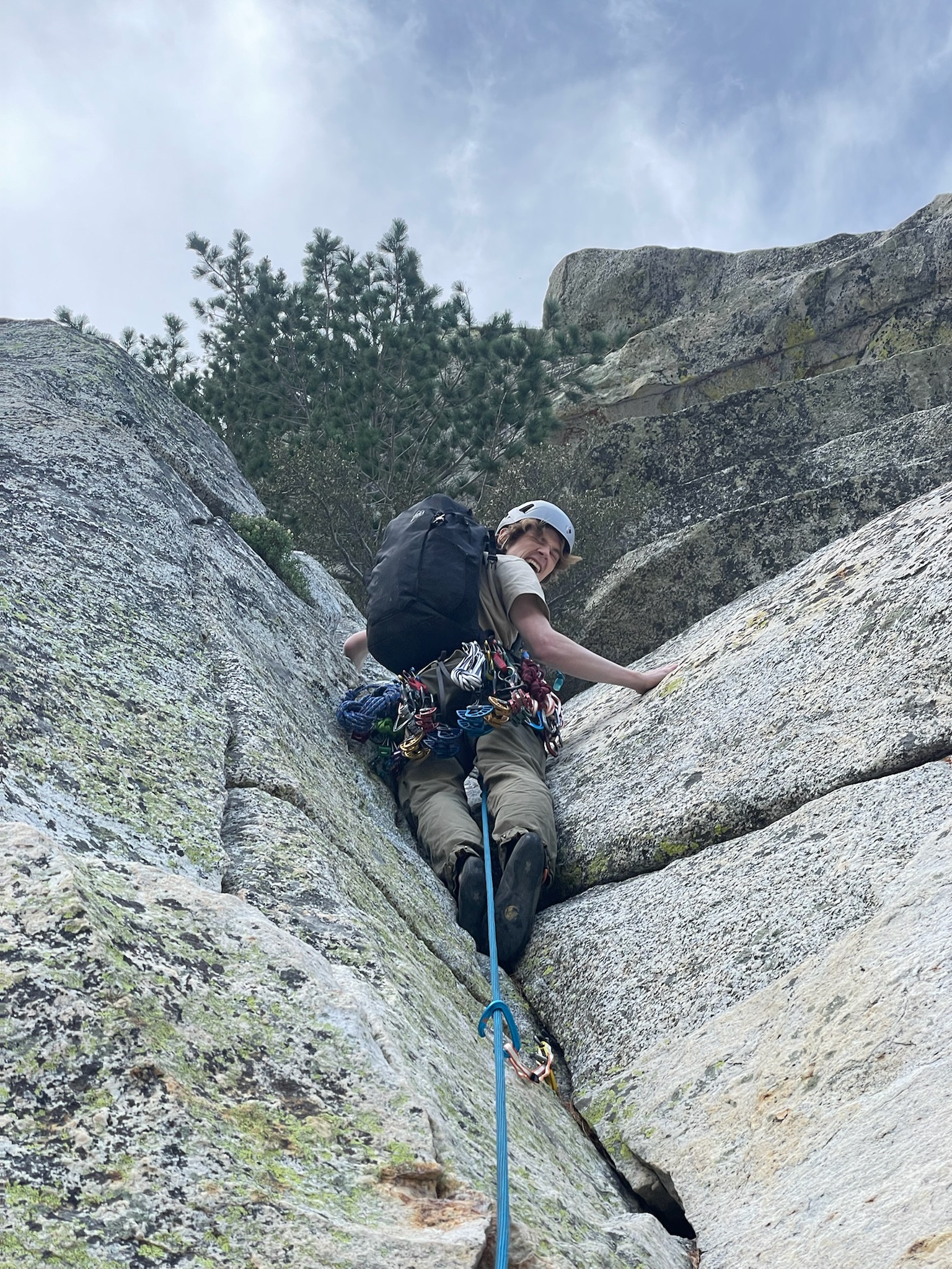 I lead pitch 5 and followed closely to the group ahead of us. Most of the route was super easy except for the final ledge which traversed to the right of the summit. I chose to wrap around the ledges and up some juggy handholds, which felt easy but had poor pro and high exposure. I managed to place a small cam anyway and mantled up the final ledge and onto some low angled slopes to the finish. At this point I had expected one more pitch and was surpised we had managed to link some of the last few pitches together. This led to a great surpise for Trevor as he followed up the last pitch and up the the belay. I was incredibly pysched to had made it to the top given our previous bail and the clear step up in difficulty for this route. Not only that, but I had felt our climb was the smoothest we had done yet on both ends. Trevor’s P1&2 leads were way faster than previously and I did not feel overly uncomfortable at any point along the climb. The doubtful corner is a super cool lead and the whole route is definitely a classic moderate of the crag. The way down on the friction pitch went smoothy and we spent the whole time discussing where and how much pizza we were about to consume. Overall this experience made me much more confident in progressing in traditional multipitch climbing and stoked to continue progressing with more climbing in the future.