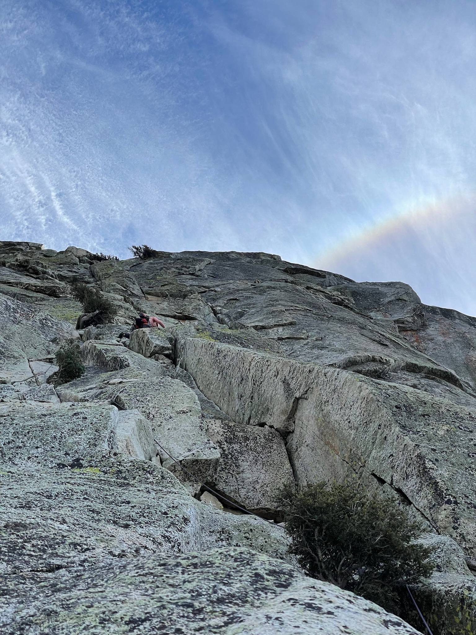 Next up was pitch 2, a similarly moderate pitch with one step over section that seemed a bit cruxy from the topo. Trevor began onwards and quickly made it out of my sight. But after this point things got a bit tricky and I began to wait it out at the belay. Soon after another group joined us, a couple with a newer follower who wound up being great belay companions. While we waited there, it was clear that there were some route finding issues ahead. Trevor was not confident where the step over was and became pretty intimidated by the more direct 5.7 route that seemed like the more obvious path ahead. To add to this, a single cam placed at the start at the route combined with the step over lead to a high amount of rope drag. A little over an hour passed and Trevor made it to the end of pitch 2 at another big rock ledge. At this point I was getting pretty nervous for the remaining leads and did a pretty poor job at following the line. When I finally got to the belay, I was not feeling good about the next pitch and I knew Trevor got a bit spooked from the previous lead. Given the time of day, uncertainty in the route, and general bad vibes, I made the call to bail for real and come back another time. Luckily for us, the group behind us also decided to bail (hopefully not from our influence) and had left a great bail anchor at pitch 1. We rapped down and only had one issue with ropes getting caught in bushes that unfortunately required some solo-ing to retrieve. Despite the failed effort, I felt really good about our decisions that day (sans the rope retrieval). It was important to me to recognize when to bail and to follow through with bad feelings in consequential terrain. Our ego’s took a hit not finishing a truly beginner route, but who cares? Really it just gave us motivation to get it the next time and saved us from a long day or potential epic.