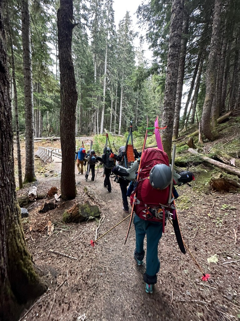 That night we chatted about the highs and lows of the day while munching on our dinner at the kitchen. We didn’t think the summit was a great option for the next day either, so instead we opted for another round of rescue practice and an afternoon exit to the trailhead. The next day we did exactly that and this time Meredith opted to experience the leap into the crevasse. It was pretty rare to get to practice on a real glacier in this fashion, so we all appreciated the second chance to hone in our skills. This time we made quick work of the rescue as we only had until about 2pm to make it back to camp. This time we also got some good turns in on the way down before starting to pack up for the day. We filled in the big kitchen holes and then awkwardly packed our loads into backpacks for the way down. Surprisingly this turned out to be one of the sketchier experiences of the weekend. Skiing down with a 50+ pound bag made for unsteady and difficult turns down the gully. I was extra careful not to hurt my knees, but knew the others in my group who were less experienced would have a tough time. Thankfully we made it down without any issues (later Sof did wind up tweaking a knee) and started back down the trail. My shoes at this point were still pretty soaked, but it was only a few miles all downhill. Before we knew it, we were all back at the trailhead in one piece. Mt. Baker stool tall above the clouds at this point and we could finally see it peaking above the trees. After distributing our gear back to John, we then made our way to a local brewery in Bellingham for some earned drinks and food. We shared stories with Ryan and Sof’s partner, who were waiting there for us to return. All of us were stoked from the experience and glad to be back to civilization. Trevor, Tanner, and myself would fly out the next morning so afterwards we headed back to their house for an early sleep.