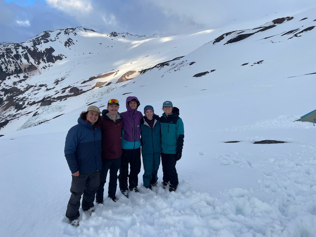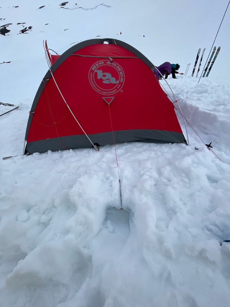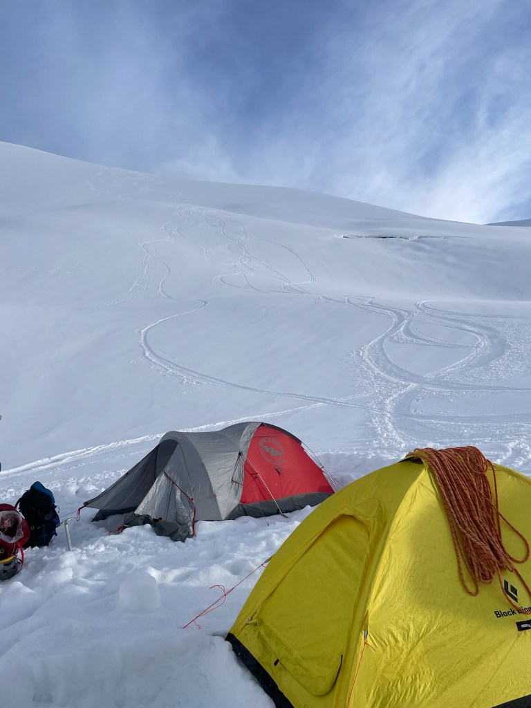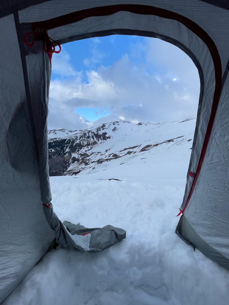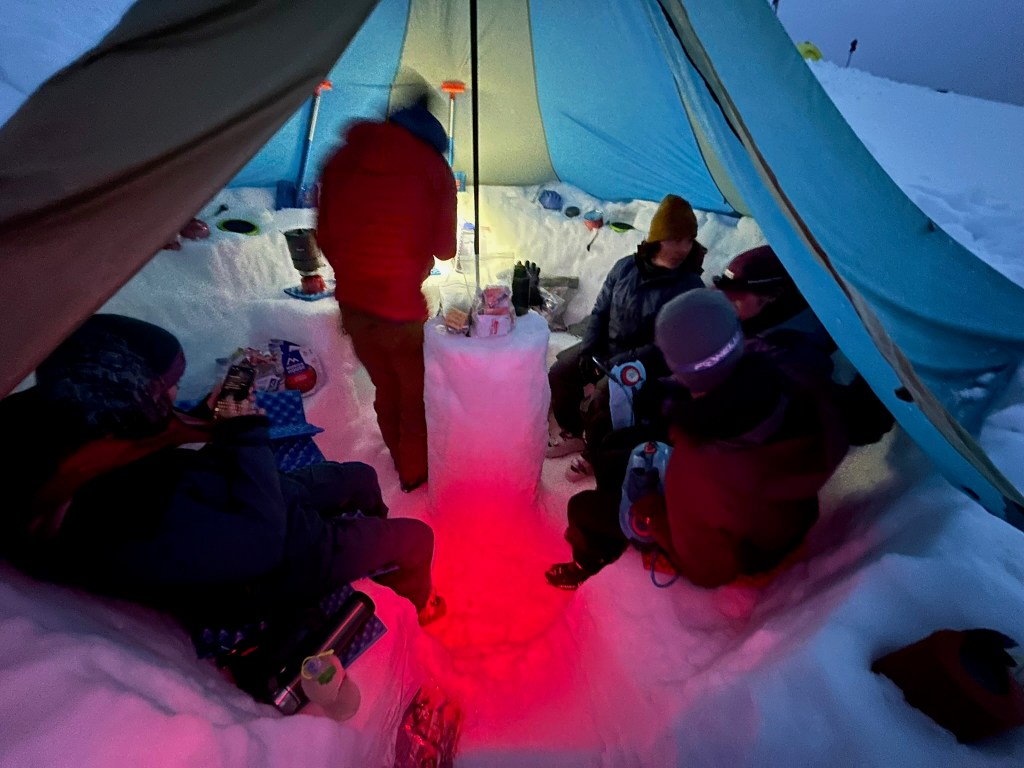 Snow camping is difficult. It requires setting up a space that you can comfortably eat and sleep regardless of the surrounding conditions. It was also collectively our first time taking this on. Our guide John quickly put us to work digging out some flat platforms for our tents to start. We carefully mapped out an area a little bigger than our tent, dug snow out from one higher end, and plopped it onto the adjacent lower end for proper flattening Next we pulled out the tents and carefully staked in 10 guidewires by digging some deadman anchors (basically a trench for the stakes that was then filled in with snow to prevent them from moving. The rainfly for the tent also extended a few feet from its entrance, so for extra comfort we also dug that section out as a ‘garage’ perfect for booting up in the morning. These were all great skills to learn, but took forever to get right and felt like endless digging in the snow. The last thing on the list for that evening was to set up the kitchen for the weekend. This was a separate communal space meant to shelter the six of us in one location, cook meals, and eat in comfort. John pulled out the ‘mid’ for this, which was a pyramid shaped tent with one central pole to keep the thing up. This was the most fun part of camp building, as we constructed an elaborate kitchen consisting of an entrance staircase, a circular bench for seating, a countertop for cooking, and a central pillar for the sole tent pole. It took another hour or two to construct, but when we were finished we could relax and cook dinner in luxury. Evening had come at this point and we were all famished from the long hike up and crazy amount of digging for camp. But our reward was awesome: dinner with friends and a view of the ridge circling the Coleman Glacier. It was a pretty surreal camping site and probably my favorite to date. That night we chatted about what might happen the following day. The original plan was to spend it learning the ropes and jumping in crevasses, but the weather was not exactly cooperating. It is inherently difficult to judge what would come, but Meredith could check every once in a while on her Garmin inReach and saw we might have our best chance for a summit push the next morning. I was pretty excited at that point and made my way to bed for an early rise.