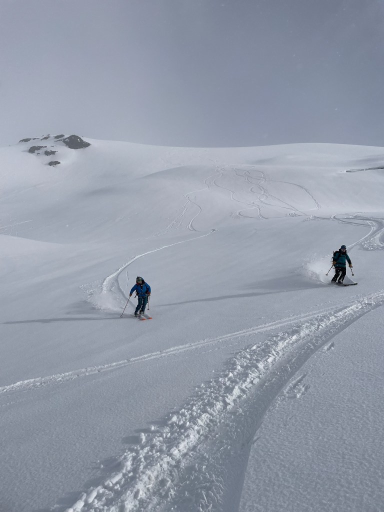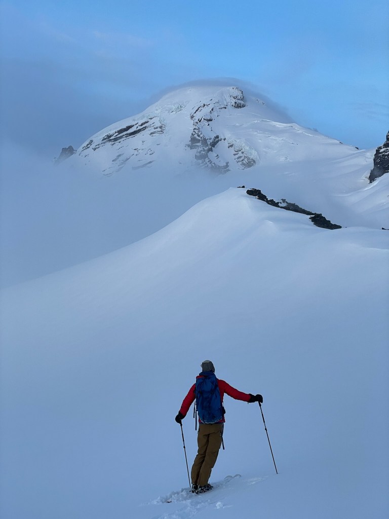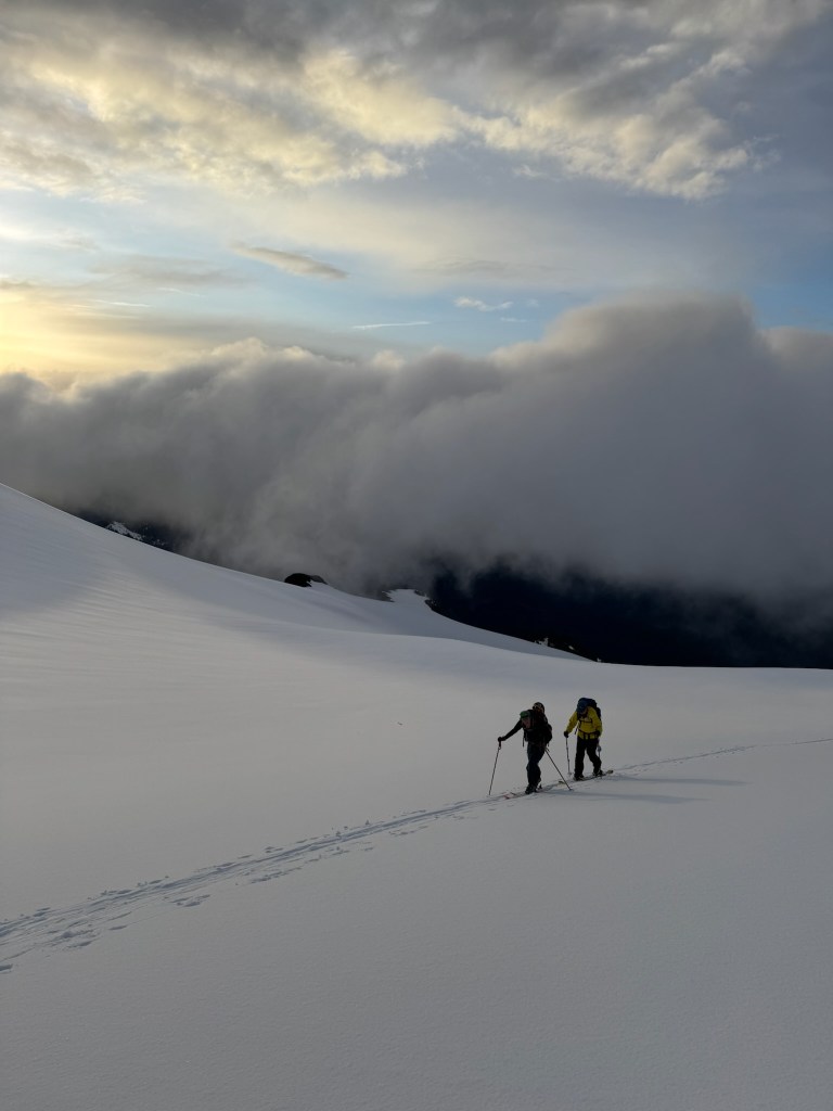 On this day we had the luxury of doing a mock rescue, where one volunteer would step off and into the crevasse. Tanner was the guinea pig, while myself and Trevor stood ready to catch him with our axes. John gave the signal and he awkwardly sunk into the abyss while Trevor and I leapt to the ground and dug in. Catching a fall was not as bad as I expected, but the aftermath seemed impossibly difficult. The rest of the group in theory would have to construct a new deadman anchor with skis, then hook up the rope before I could get out from my position clenching the ice axe. Rigging this up and hauling Tanner out was still pretty fun, but I still could not imagine how difficult a real experience would be. At this point it was getting late in the day and we started making our way back down the glacier. Weather was surprising clearing just a little bit and this made for a pretty surreal descent. It was snowing periodically throughout the day and allowed for big arching turns down good snow. In the foreground was a spectacular view of the alpine environment and skiing down felt like we were on a different planet. Anywhere you looked were vast stretches of white with a cloud layer below. As we made it towards camp, the last thousand feet or so was prime powder and we all got a spectacular party lap right to our tents. This was the best consolation prize we could have gotten and immediately we all were thinking of a second lap. It was a little past 7 at that point, so we quickly put our skins back on and headed up the ridge once more. This was probably my favorite part of the whole trip as we got glorious views of the Thunder Glacier to our right and Mt. Baker’s summit to our left. Clouds peaked in and out until we eventually snagged some momentarily crystal clear views of the area. As we basked in the view, we quickly transitioned one last time and got ready for a second powder lap. It was about 8pm in the middle of May and here we were skiing some pristine snow with great friends right back to camp. Even though we didn’t summit, this was such a great gift for an otherwise uncertain weekend.