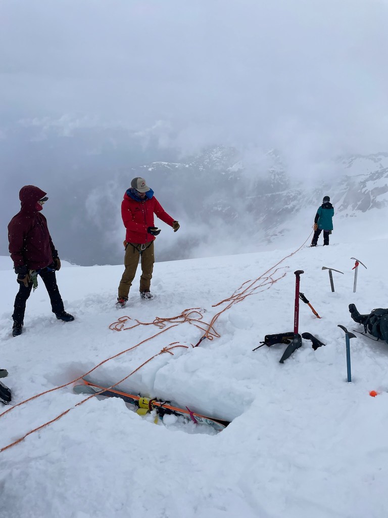 Thankfully we cleared this section without much of an issue. The group was a bit tired and the weather was still not perfect, but the six of us made it to the col and took a much needed rest. Unfortunately this was still not our day. The summit ridge was a hardpack of variable conditions, mainly ice. Climbing us this section would require the group to be ‘short roped’ and we’d likely have to downclimb the headwall instead of skiing. Combined with the fact that this additional 1500 ft or so of elevation would put us well into the evening, we reluctantly made the call to head back down. Regardless of this decision, this meant we could ski down and spend some time learning our intended crevasse rescue for the day. We skied back down until we reached the edge of an obvious and massive crevasse to begin. Normally when traversing this type of terrain, all members of the group are tied together with a single rope. In the case that one person falls into a crevasse, the others quickly arrest the fall with an ice axe and then preform a fairly involved rescue – the goal for the day. John gave a great intro and we all demonstrated our knot skills before starting off (I delivered candy bars at this point as promised). Next we practiced building an anchor out of a pair of skis buried in the snow. This deadman anchor was the same style of support as our tent stakes from before and served as a central secure point to haul someone out of a crevasse safely. Next up came some complex rope management which allows one of us to safely check on the victim, prepare a safe edge of the crevasse wall for rope to pass through, and finally set up a rigging system of pulleys that create enough leverage to pull someone vertically up and out of the crevasse. I’ll spare the details, but it was much more complicated than I had imagined. Preforming a practice rescue in a relatively safe situation is one thing, but doing this without a guide and in consequential terrain with lives at stake still seems incredibly daunting to me. For any future days out on a glacier I’d have to put in much more practice.