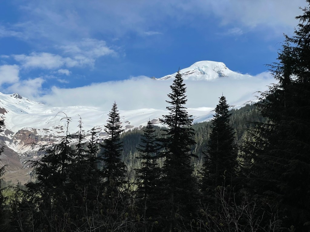 It wasn’t long after we arrived that we set off for the Heliotrope trailhead, which would deliver us into the alpine. The trail itself was well maintained and beautiful. The trees were covered with thick and vibrant green moss while the rivers rushed with peak snow melt. After a few miles we saw the first bits of snow, which looked like mini glaciers of their own tucked into the bottom of gullies and riverbeds. We cross some of these rivers and snow patches still in our hiking boots before eventually making it to the first region of continuous snow. It was also raining at this point and I could feel my shoes and outer layers progressively getting soaked in. In total we were only climbing maybe 2500 ft that day and the majority of this was not on skis. Finally transitioning to skinning and taking them off our backs was a big relief. My pack was still heavy, but zig-zagging up the next gully on skis felt way more efficient and got me excited for what was ahead. A few more kick turns up the gully later and we could see some other climbers making their descent down the ridge above. Once we got there ourselves the whole environment dramatically changed. What was a sheltered and snowy forest was now an immense and rugged alpine environment. To our left was the Coleman Glacier, which was littered with crevasses and ended in an imposing icefall that shattered into the drainage below. Above us was the summit of Mt. Baker, shrouded in a thick set of clouds that rained and snowed down on us still. Every once in a while we’d get a new portal through the clouds and see some other vast expanse of rock and ice. Before I knew it were had gained the ridge and were ready to set up our camp for the weekend.