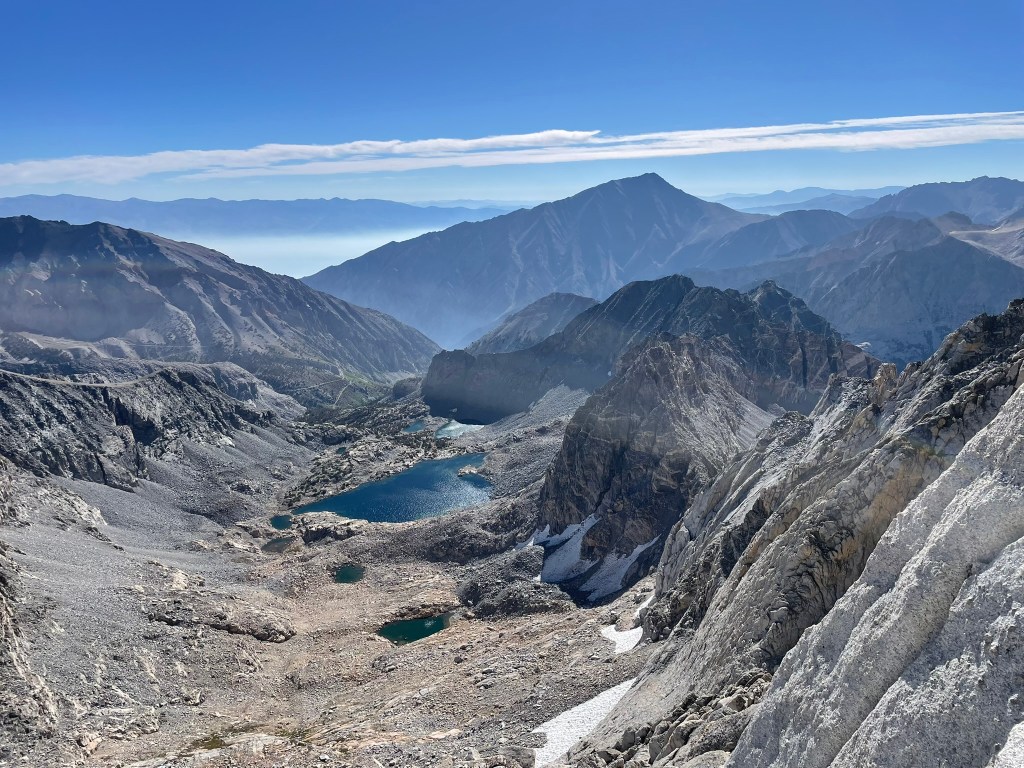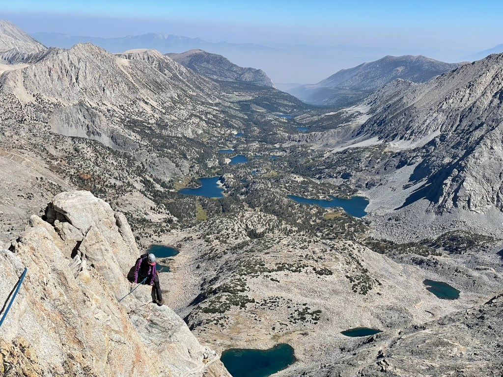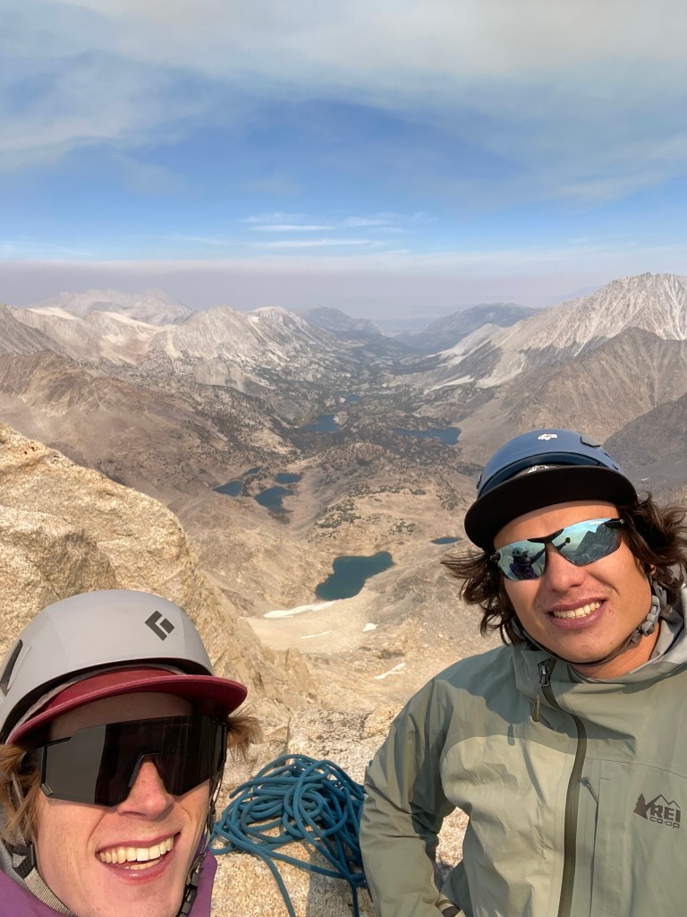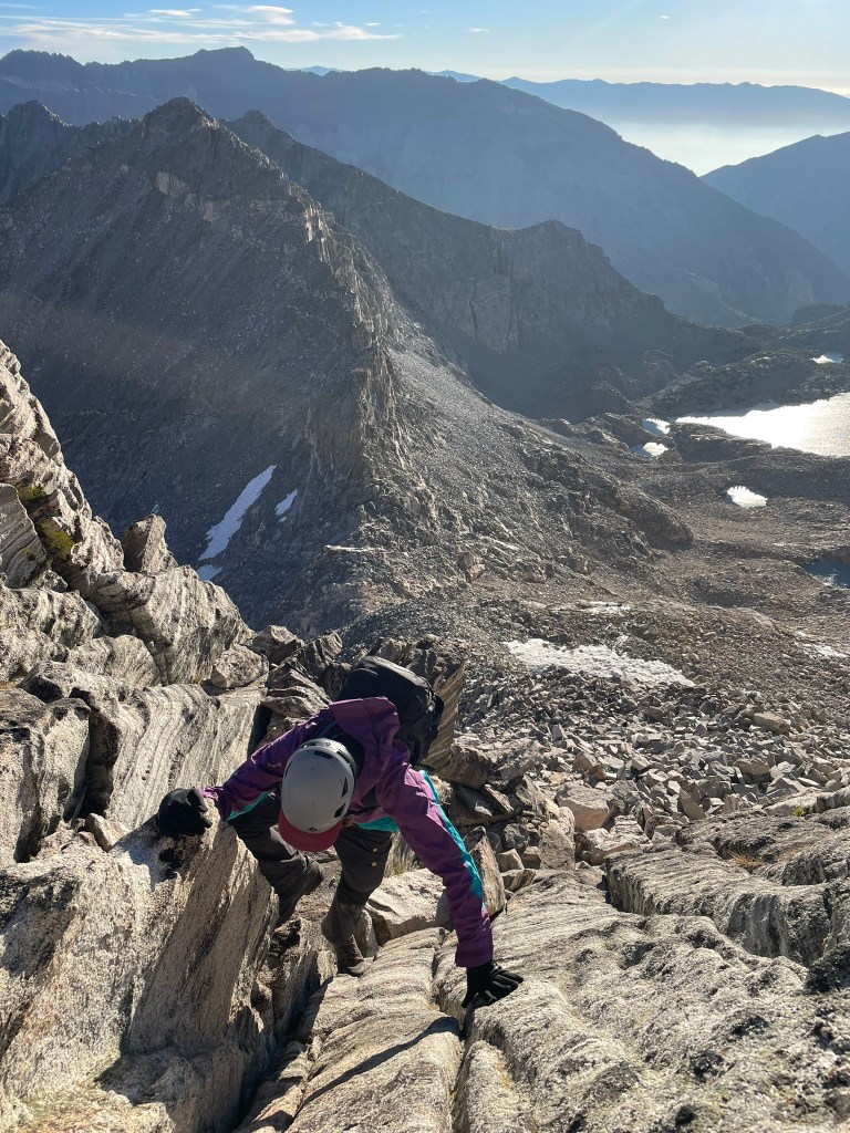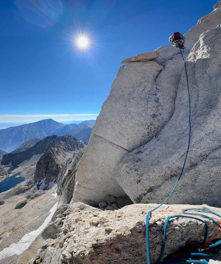 Looking back at the climb, I saw the sharp end of the rope and harder terrain ahead. This was the moment for me that makes alpine climbing so special. We just put in a tremendous effort to get to this pitch and now it was game time. Right off the belay was a couple of reachy moves to gain the next ledge ahead. There I didn’t see any great options outside of a corner with balancey feet to my left. I put in two pieces of protection and calmly search for good feet placements before committing off the ledge and over exposure. I quickly moved past the corner and onto stepped up to the next rest, which felt like such a great relief. Ahead were still home insecure moves here and there, but this felt like the obvious crux of the ridge so far. This made the climbing super fun and the thousands of feet of exposure on either end felt less intimidating. Before I knew it, I felt the end of the rope and made a quick anchor around one of the numerous horns of the ridge. The summit was pretty close and all that stood in the way was a traverse, short gulley, and maybe 50 ft more ridgeline. Trevor lead this portion and got through some cool moves of his own. But at the same time anchor building was difficult and we lost quite a bit of time through this portion of terrain trying to figure out the best systems for protection. This involved an awkward gear belay and a short section of hard to protect chimney’ing. Regardless once we made it through this section we immediately saw the summit block and knew we were gonna make it out okay. I still roped up for this section and made it to the summit register within 30 ft or so. Technically the real summit still required a boulder problem rated 5.6R. It was exposed to quite a large drop-off and seems like another case delicate footwork with an awkward mantle finish. We both immediately agreed to skip it for the day and instead focused on getting down the mountain. Behind us was another crazy ridgeline view with a Little Lakes valley backdrop I think I’ll always remember vividly.