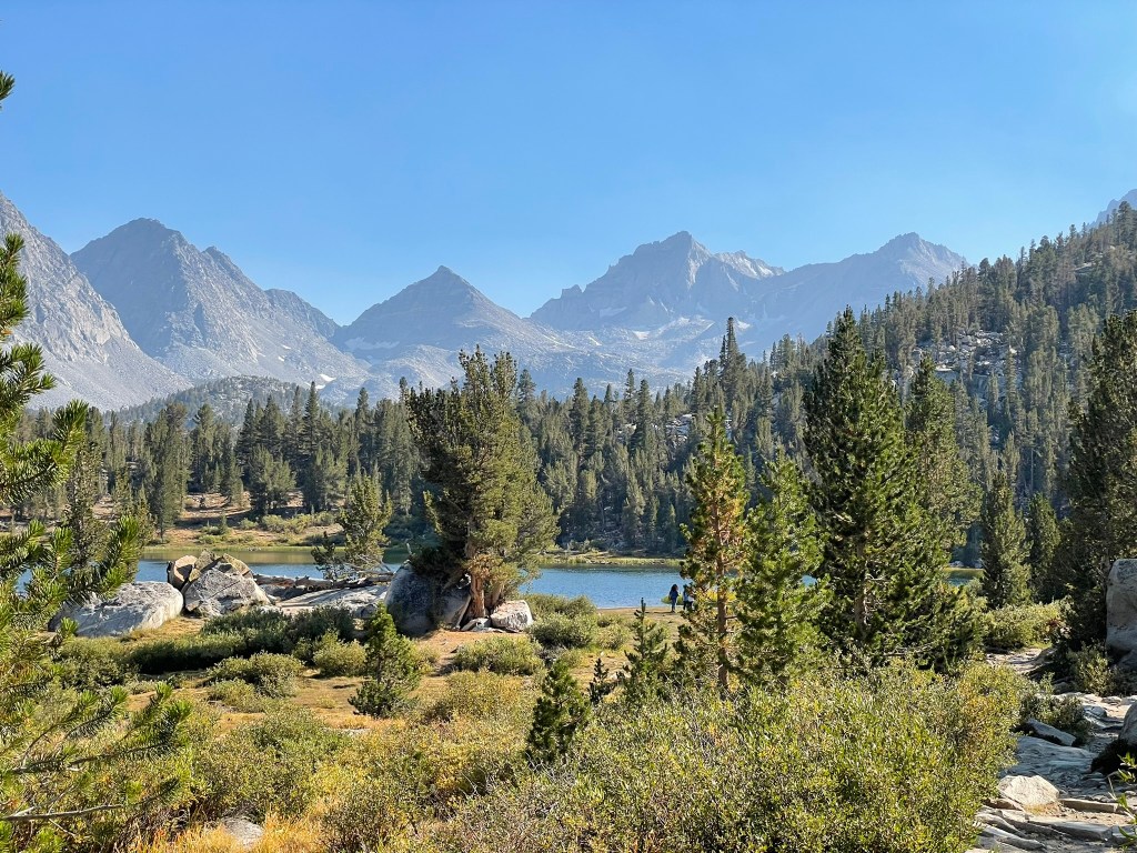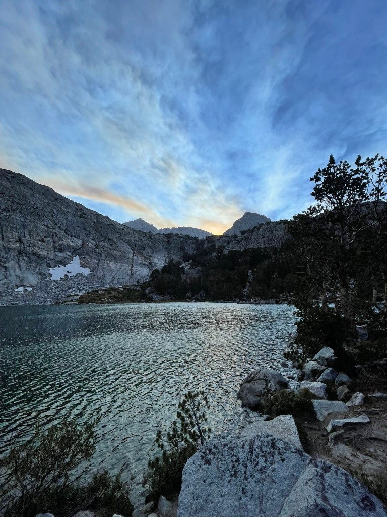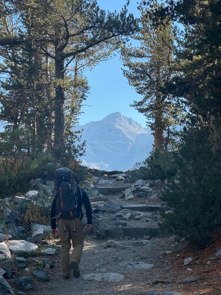 The plan was to arrive at Mosquito Flats trailhead by around 3pm that day. We’d hike in a few miles and camp right below the talus fields encircling Bear Creek Spire. This would give us a full day to climb the route, hike back to the trailhead, and drive back home. In classic fashion it would be two days of almost continuous movement. Despite this, driving out felt easier than usual. The whole time I was excited and nervous. I knew I’d have to just stay calm and excited in order to keep the right headspace. Luckily I made it to the trailhead right on time and missed nearly all the traffic on the way. The only hiccup was driving through a ominous trail of smoke clouds engulfing a large portion of the Eastern Sierra on the way down to Rock Creek. Winds were coming from the SE and we were pretty sure we were in the clear. At the trailhead we also realized I had forgotten by Rockie Talkie and headlamp, but keep on regardless to save time. As we hiked in it was easy to forget about these issues, the scenery was incredible and the tail was nearly dead flat. Along the way we continued to pass serene lakes lined with tall wavy grass and accompanied by calm rivers. We passed handful of backpackers and fisherman who all seemed similarly at peace in the valley. Bear Creek Spire was the largest peak visible ahead of us and towered over the valley. The NE ridge was big and it ended in a knife edge ridge which guarded its summit. The ambiance was similar to the Grand Teton in that our entrance was peaceful and juxtaposed by gigantic and imposing rock spires ahead. But in all the hike went quickly and we were able to set up camp in the light with time to spare. Trevor even brought a switch to play Silksong despite us not really playing much at camp. Bed time was just after 9 pm and gave us nearly a full night of sleep ahead of our 4 am alarm.