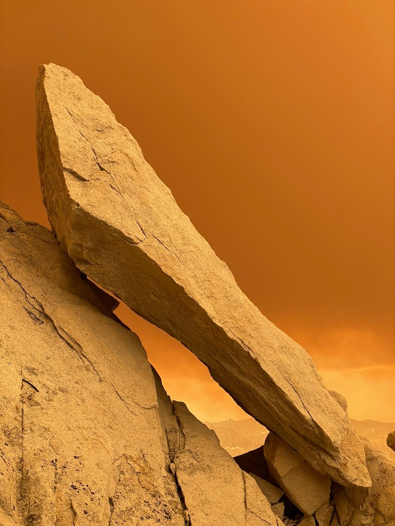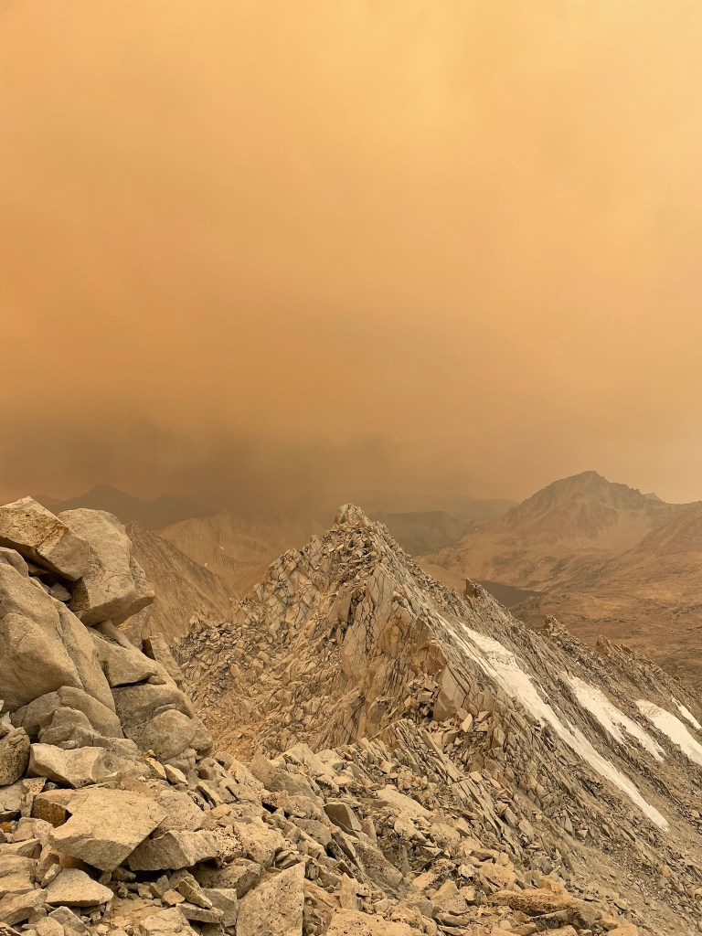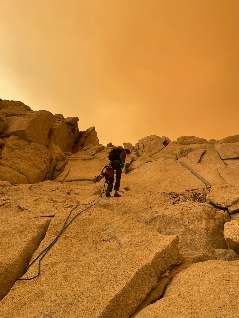 But the view didn’t last long, as we added some cord to the existing tat-ridden anchor we could see a puffy and out of place cloud in the distance. Before we both made it off repel, the cloud quickly turned into large sweeps of red-orange smoke that would consume the entire area. Blue skies and sprawling landscapes turned into dramatically red tinted backdrops of nearby peaks and a otherwise brown haze. We joked about its resemblance of mars or mordor, but also wanted to get out of there as soon as possible. The smell was clearly of burning wood and exposure to this was certainly doing damage to our respiration. Making it out involved a return to the endless talus fields and so we got a move onto the next col between Bear Creek Spire the next NW peak. As high quality as the rock on the NE ridge was, the terrain following this col was equally poor. We chose to downclimb this section, which was maybe a hundred feet or so of 3rd to 4th class choss. Some of it was sand and some of it was large loose blocks that we’d toss down the mountain at our discretion. It was pretty clear we would make it down, but we remained on edge the whole time and had to be very methodical with our chosen hand or foot holds. At the bottom of this short headwall we returned to the endless talus. We’d take one or two short breaks and otherwise tried to descend as quickly as possible.