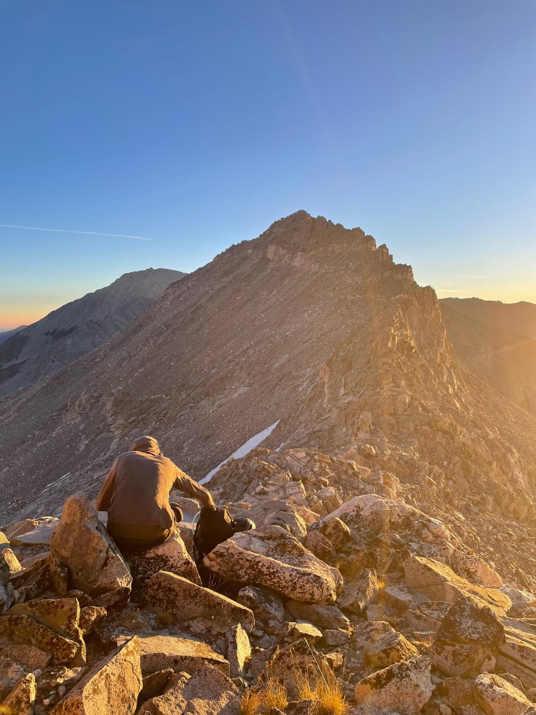 Alpine climbing is an inherently polarizing experience. My friends and I’s last trip to the HighSierra (link here) was just as incredible as it was exhausting. Alongside climbing in a truly unreal setting, we achieved our longstanding goal of climbing Whitney in good style. It also was one of the most sustained and difficult physical experiences in my lifetime. We overcame challenges at pretty much every turn and I spent nearly every waking hour either driving or climbing for 2-1/2 days. Coming back from a trip like that convinced me to take an extended break from big backcountry trips. I knew that I’d earn a new inspiration for climbing if I was patient and gave myself time to decompress after such a harrowing adventure. So for a month or two this summer I spent time in the bay area enjoying biking, camping, and running in and around the city. But as Fall came an opportunity arose that reignited my energy for big and challenging objectives. This time it was a route that Trevor and I had been eyeing up ever since our trip to the Grand Teton and one that we’ve failed to commit to several times. Bear Creek Spire is a nearly 14k ft peak between Mammoth Lakes and Bishop County and is home to three classic alpine climbs (as listed in the book “Sierra Classics: 100 Best Climbs in the High Sierra”). We were interest in the easiest of the three located on the NE ridge. It was rated between hard 4th class & ~5.5 climbing when sticking to the true ridgeline, but was substantially longer of a route than we had climbed before. It rose ~1500 ft above Peppermint Pass and about half of this was steeper than 3rd class terrain. It would require us to move much quicker than we had in the past and climb without necessarily using a belay for all pitches. Given we’ve never simul-climbed before, Trevor and I knew we’d have to give ourselves time and strike with a good weather window. So midweek on an early September day, I messaged Trevor and committed to driving out that coming Saturday.